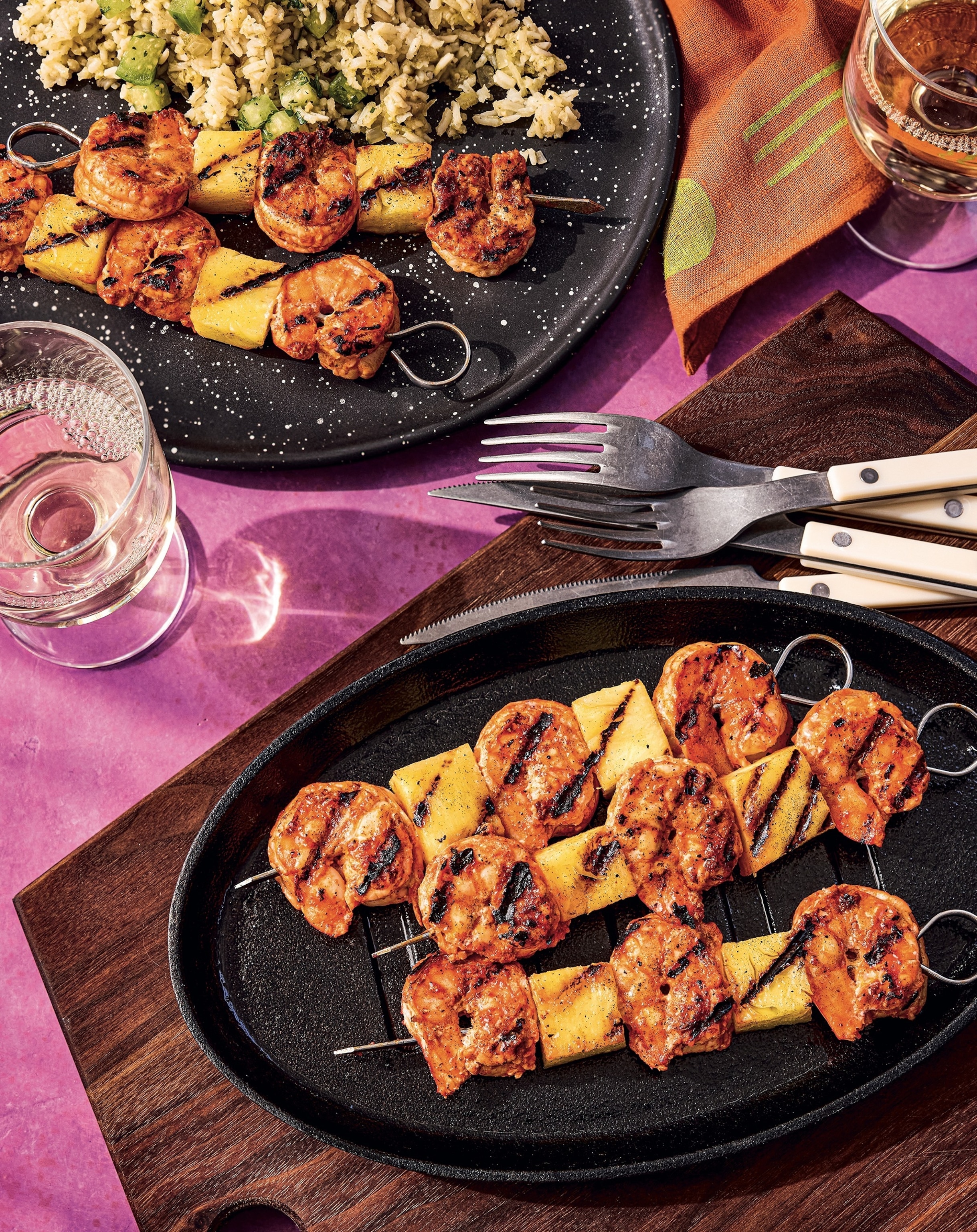 He continues, "I like to pierce the shrimp at two points: through the tail first, then again at the head, so they stay flat and cook evenly. Remember, if you’re using bamboo skewers, you’ll want to give them a soak for a few hours! This goes great with Tomatillo Arroz Verde (page 127) and some charred corn tortillas."