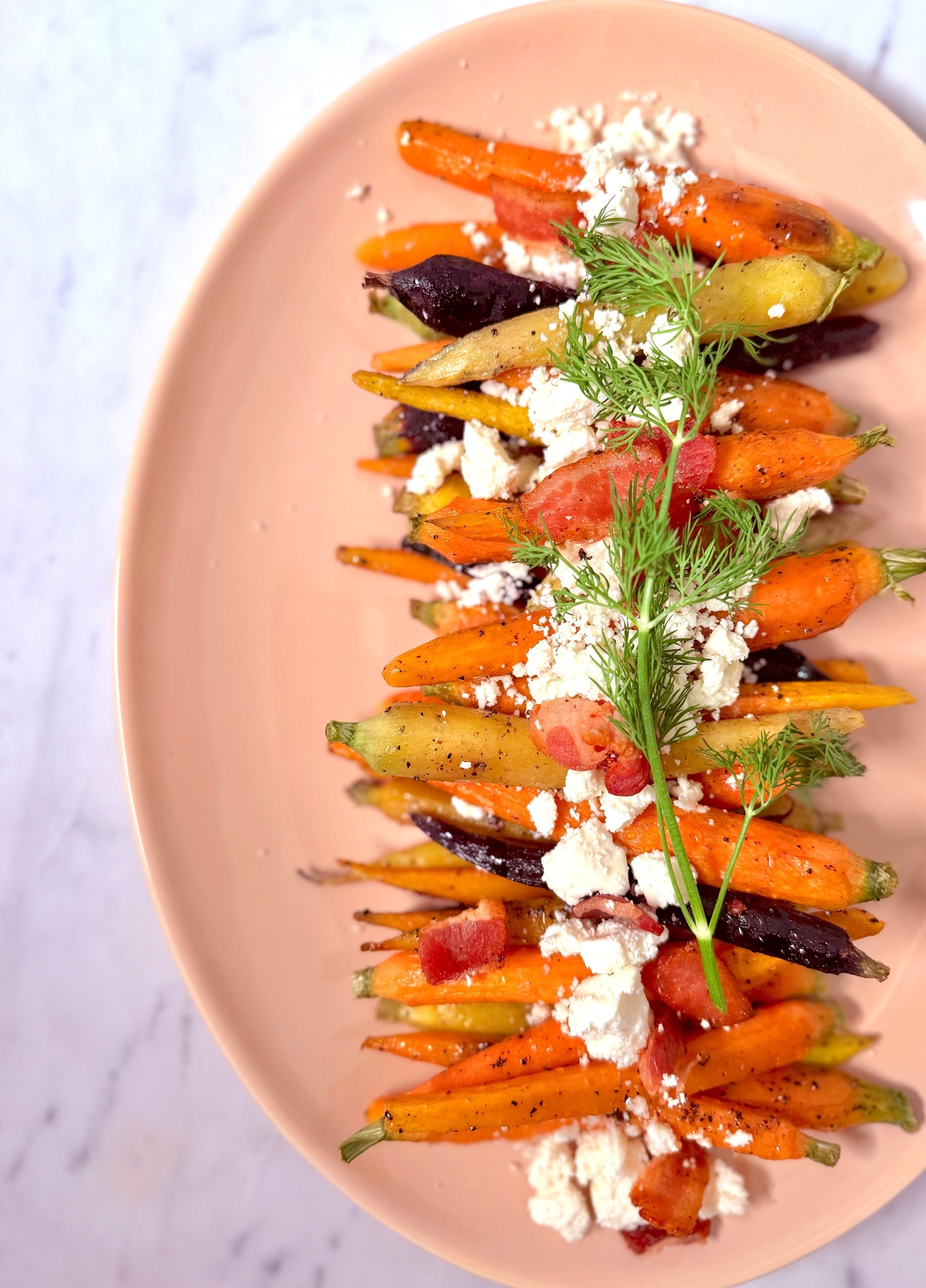 Oven-roasted Rainbow Carrots with Honey, Queso Fresco and Bacon